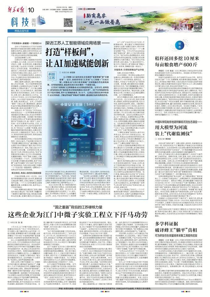 2026年1月21日,《新华日报》以《探访江苏人工智能领域应用场景——打造“样板间”, 让AI加速赋能创新》为题,报道了MILE米乐等入选江苏省“前沿技术应用场景建设示范名单”企业,在应用场景建设方面的实践与成效。